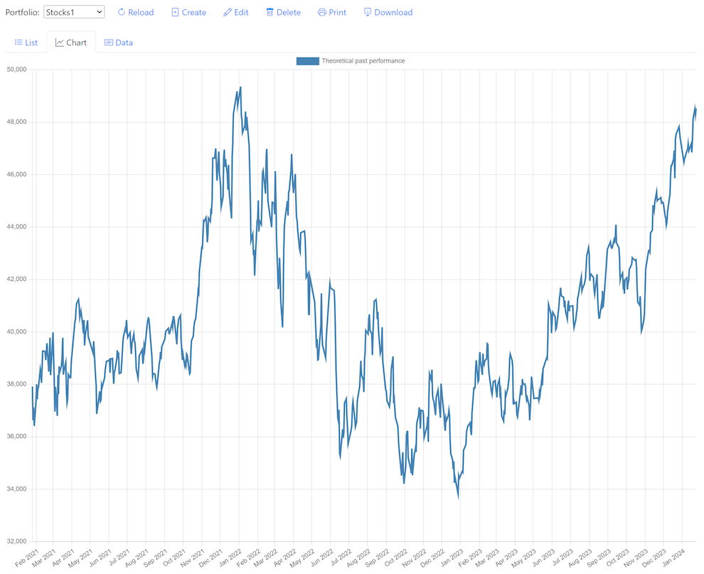 The "Chart" tab displays a theoretical past-performance chart for the last three years - the value over time of your investment if you had entered the positions three years ago. The chart does not reflect new price movements after optimization.
