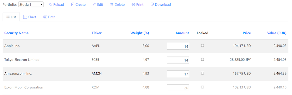 - Weight (%): The total weight of a single stock in your portfolio (considering the last closing price, amount, and currency conversion)